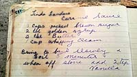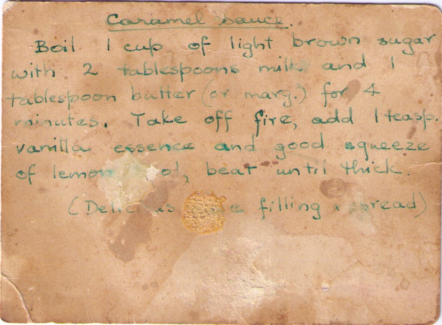 Thank you, Moi, for handing me the recipe card that you found recently (see pic). In Mum’s hand, is the recipe for Caramel Sauce. This one, though, is not to be confused with the Linda Landers Caramel Sauce recipe. The former could be termed the ‘lite’ version but as both contain vast proportions of sugar, it really doesn’t matter! Having just tasted a wee swirl atop my ‘lite’ frozen yoghurt, I am definitely soaring in the heady stratosphere of a sugar high. I have very fond memories of scraping the last remnants of melted ice-cream and caramel sauce from my dessert bowl at Sunday lunch (no rude comments, please, about where that led me!).